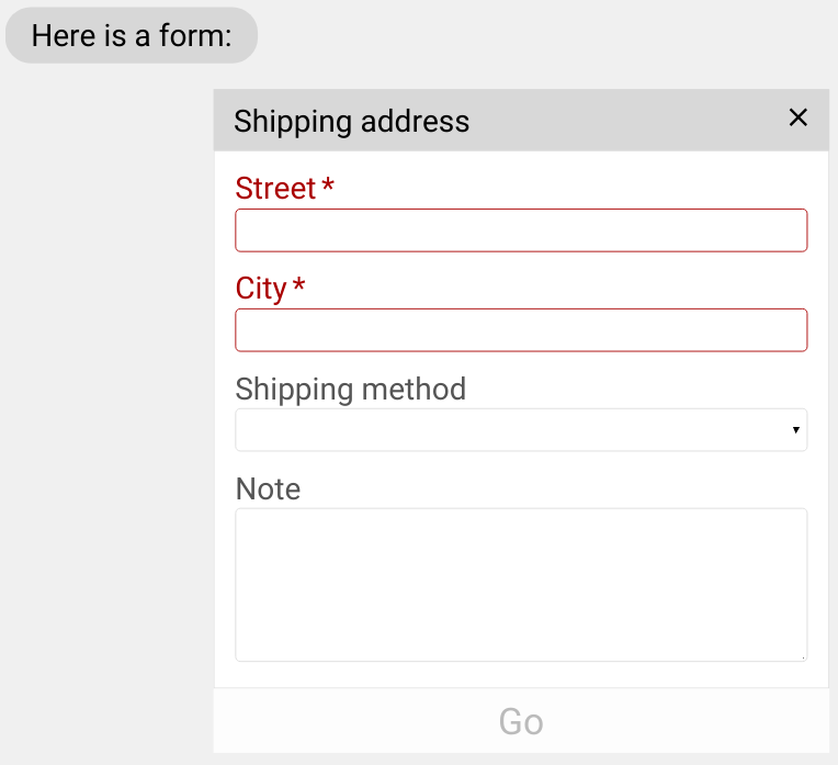 The form input method presents an entire form to the user inside the conversation. This can be used to let the user answer multiple questions at once, for instance, to ask somebody for his address details.