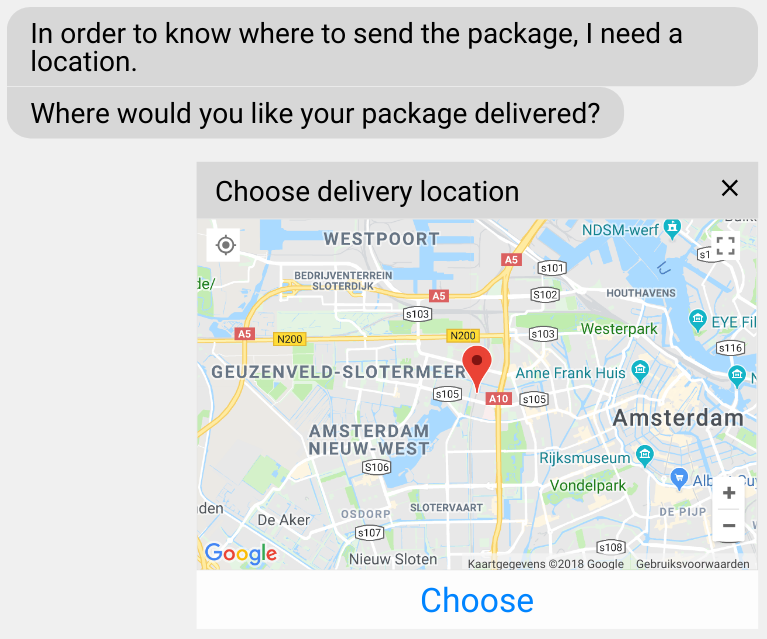 An an example, when your conversation needs to get a user's location, it is nice to present a specialized location picker widget for sending the location, which includes a map and the user's current position: