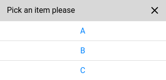 • items — The array of items that the user can choose from. The list can be either a list of plain strings, or it can be a list of maps with value, title elements (and optionally a subtitle).