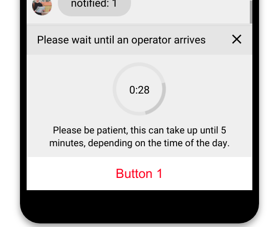 • wait_time - An optional number, the amount in seconds to wait. When given, it will display a countdown timer inside the spinner, like in the screenshow. If the countdown reaches zero, the dialog continues, with a timeout message being given as answer to the chat process. When given wait_time: 0, no countdown will be shown and the control will be shown indefinitely. When wait_time is omitted, no spinner is shown.