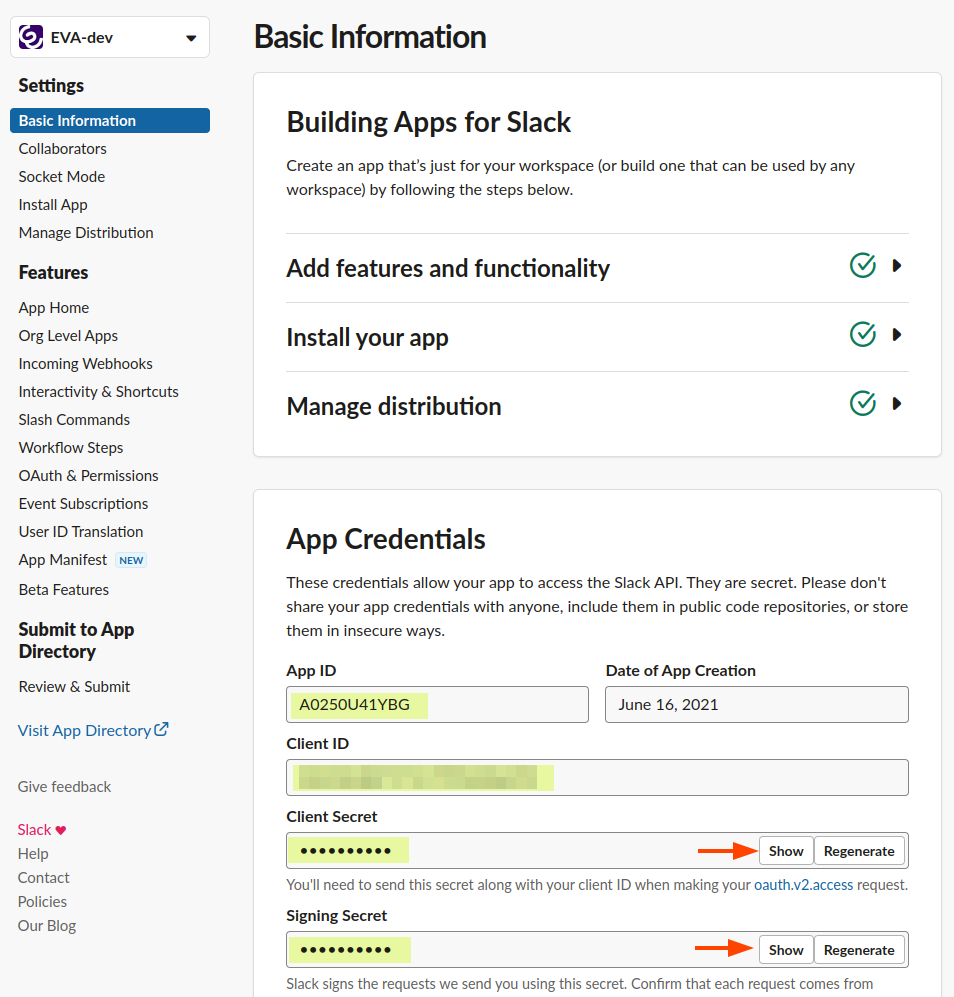 After having done that, fill in the App ID, Client ID, Client Secret and Signing Secret, which can be found on the Basic Information page: