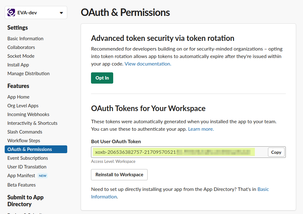 Then, copy the Bot User OAuth token which can be found on the OAuth and Permissions page: