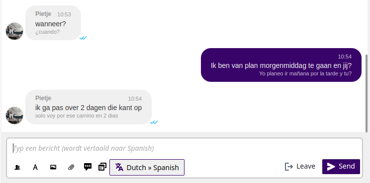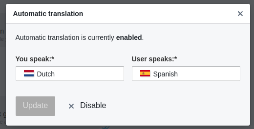 The auto translation feature is a setting on a conversation, that can be enabled by clicking the translation button in the input bar, which then shows the following dialog in which automatic translation can be configured or disabled: